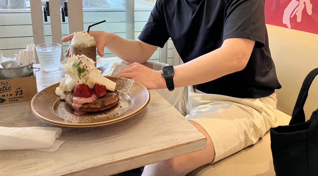 海を眺めながらベリーチーズパンケーキとホイップクリームをトッピングしたアイスカフェラテを美味しくいただきました。