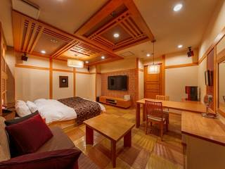 食事も頂けるテーブルに感動!メニューは沢山、お泊りに最高ですね!帰りに気付いたのですが、ロビーには焼酎サービスもありました。飲めば良かったな(笑)