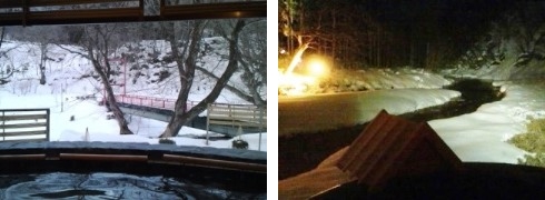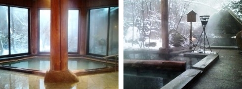 昼間と夜の露天風呂です。東北という感じですよね!しんしんと寒いのでお風呂が気持ちいいです。