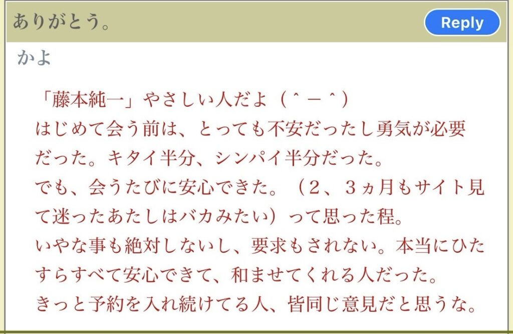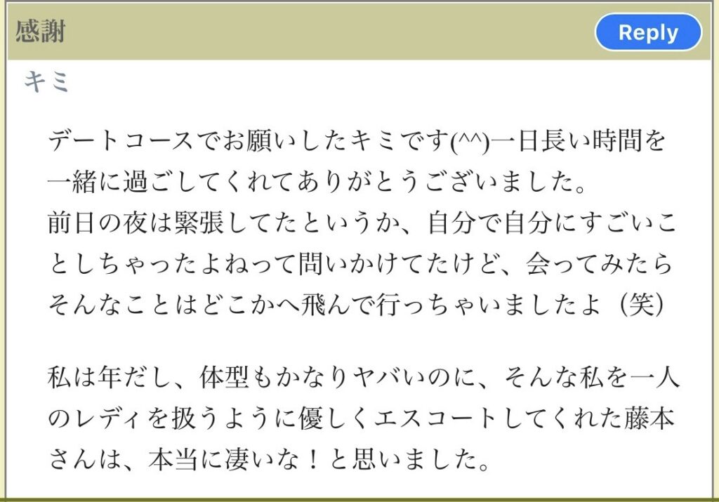 藤本です。女性の方々とデートをさせて頂きました。そしてその時の感想を掲示板に書いて下さいました。紹介させて頂きます。