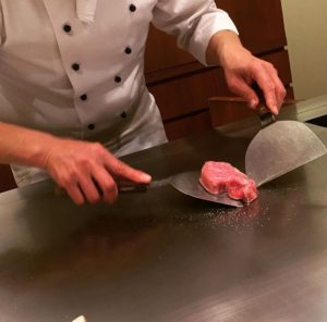 目の前の鉄板でコックさんが焼いてくれるスタイル♡